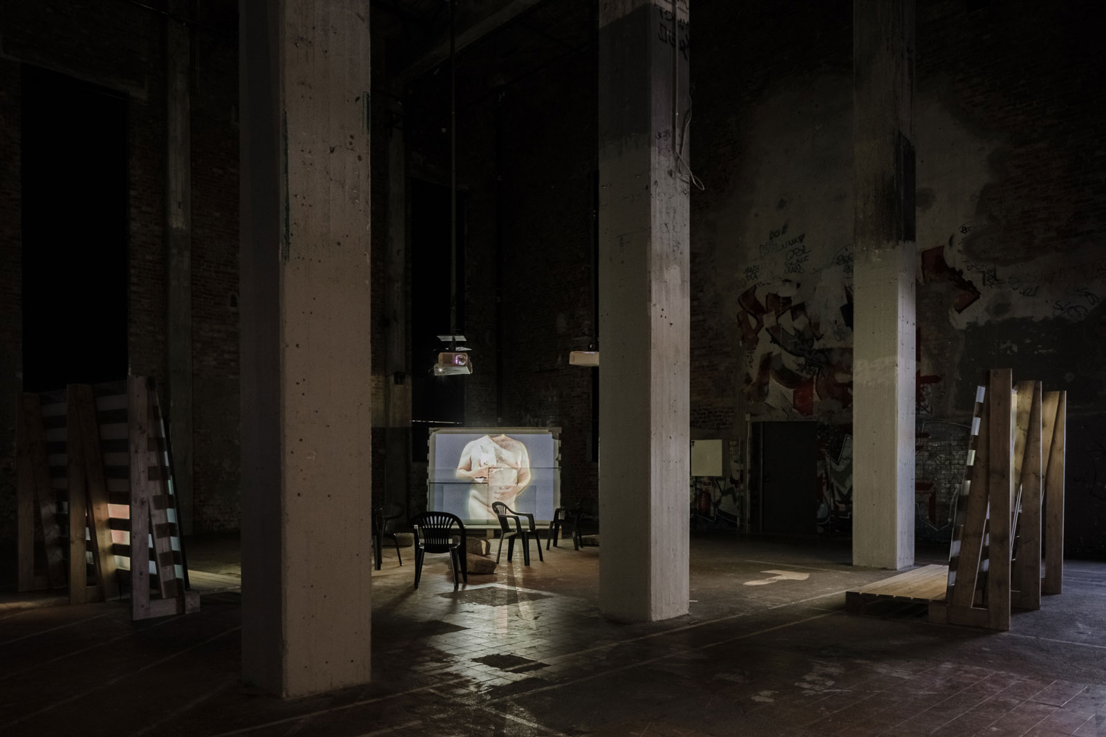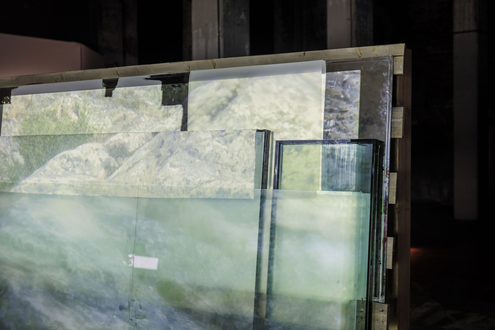 The three large projection screens in the installation are made from multiple layers of window and mirror glass, often cracked or broken, combined with pieces of white poplin cotton and tracing paper. These assemblages rest on specially constructed wooden racks, which resemble traditional glass racks built from pallets. The panes of glass have been treated with different paints to make them reflect the projected image to varying degrees, but the layers of double- and triple-glazing make the image shimmer and repeat; areas of unpainted mirror also throw the image to opposite walls or screens, producing additional, disorientating 'ghost' images. The result, across the three screens and the exhibition space, is a fragmented image-ensemble that constantly circulates around the viewer.