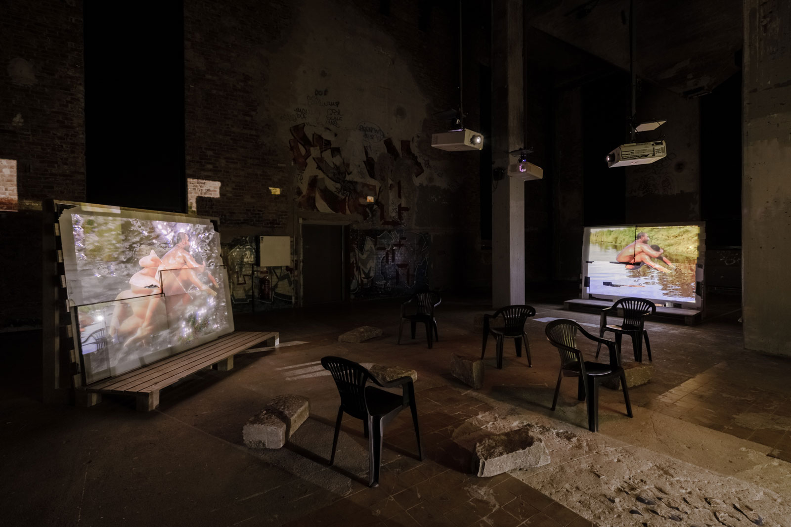 Because of the spatial design of the installation, furthermore, all three screens can never be seen at once: the viewer has to orientate themselves constantly in relation to the image. In the space where the viewers sit between the three screens, large rectangular stones are also spread around the space.